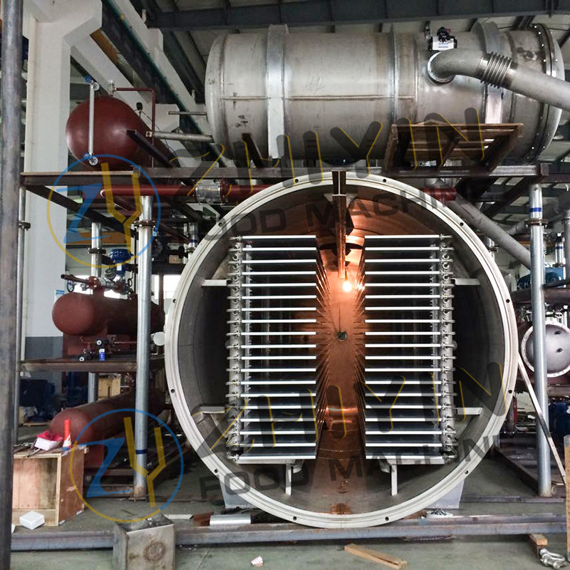 2, радиационный морозильный сушильщик: лучше для твердого материала, главным образом для мудия или крупномасштабного производства.Тарелки и подносы сделаны из алюминия, с IQF.Охлаждение в IQF и нагрев на пластинах, а материал загружается тележкой на рельсовую систему.